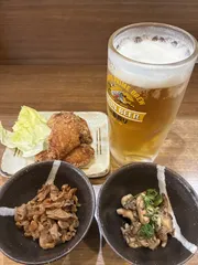 まちバル④鳥心。生中、小鉢(心のこり、銀皮の甘辛煮)、手羽のフライドチキン3個。1,000円。うまかった。