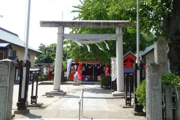 堀切天祖神社 次は堀切菖蒲園駅近くの堀切天祖神社です。こちらは朱くないお稲荷さんです。そして守護の狐は、山犬のように精悍でした。こちらも末社です。手水舎です。向日葵が飾られています。手水舎には、風鈴もありました。また末社がありました。そして狛犬以外に、陶器製の獅子らしき像がありました。こちらは末社の天満宮です。な