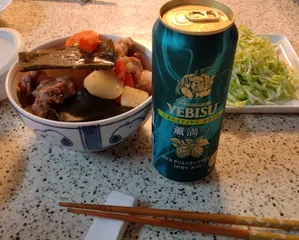 薫満つ 後ろは、ソーキとキャベツの千切りです。乾杯!ヱビス~