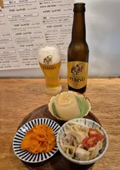 【兵庫・姫路】おだしとワインとお料理と。motto “ワインとおだしと料理と。motto”という店名で,ワインバーです。今回は,おばんざい3種盛りと串かつ2種盛を頂きました。おばんざいの大根は,めちゃくちゃ柔らかいです。おだしが染みています。ヱビスビールと合います。今回は頂きませんでしたが,“えびそば”や“まぜそば”も人気です。神戸牛のステーキもお祝