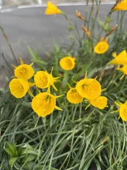 今日近所を歩いていて可愛らしい花を見つけました。ああ黄色い花が沢山咲いてるなぁと思い、近づいて気づきました。あれ?ちょっと変わった形……早速アプリさまにお伺いを立てたところ、ゲンシュスイセン、別名ペチコートスイセンとのこと。確かにペチコートみたいなスカート状の形のお花です。明るい黄色もパッと目につい
