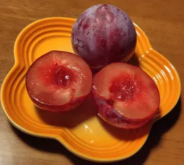 すもも サンルージュという品種です果肉が真っ赤で驚きました😯 果汁が豊富で酸味がほとんどありません♡ 届いた時点でよく熟していて柔らかく皮ごとカットするのも難しいぐらいでした すももにもいろいろな種類があるのですね生産者さんに感謝です✨️✨️