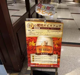 YEBISU BAR THE GRILL なんばCITY店 隣接しているストリートで「なんば秋祭り」開催中。クラフトビールのブリュワリーさんが参加してました。時間的にも有りますがそこに人が流れているのかYEBISUBARは静かなもの。荒木飛呂彦氏のポスターもロングショトでOK📷✨滅多にない落ち着いた店内にニンマリしちゃいました 先ずは安定のLINE