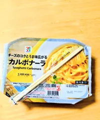 麺にはお箸⁉️ カルボナーラが食べたい❕でも私しか食べないと言う事で頼るのはコンビニエンスです🤭お支払いを済ませた所、お箸を付けてくれました😅少し戸惑いながらも、レジの方の好意を有り難く思いながらお箸でランチカルボを頂きました🍝🥰