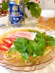 急に あきになったきがします。。 ミントとバジルと生ハムとミニトマトとオリーブオイル。 そうめん