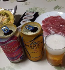 兄弟かなぁ🍻❔❕ 冷蔵庫の半端ビール🍻😆他社ですが➰ブレモル🍻普通のブレモルとブレモル・魅惑の香り✨🍺✨🍺〈魅惑の香り〉の方が旨い💮鹿児島かつお🐟+🧅サバ寿司🍣ジェノベーゼのシーフードピザ🍕エトセトラ❔❕それぞれ旨い😆✨💡何でも合っちゃいます🍺✨🍺😋😋👏