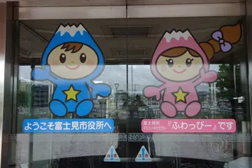 富士見市役所 富士見市役所では、入口でふわっぴーが歓迎してくれます。また商店街を飾る、ももクロとふわっぴーのコラボの垂れ幕も飾られていました。