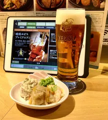 椎茸の肉詰め! 今日は、秋の味覚、椎茸に肉詰めでYEBISUを頂きました。椎茸が肉厚で美味しかったです。