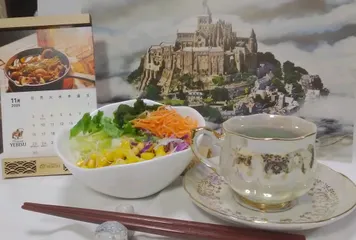 ちょっとフランス風な雰囲気で! ちょっとフランス風な雰囲気で!洒落た感じのカップが何となくフランスっぽい?それともモン・サン・ミッシェルの背景の方?≪ここは箸では無くフォークでしょう! (影の声)≫