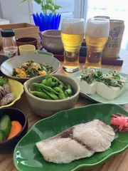暑いので‥ 外は暑くてムシムシするので 外出を早々に諦めた結果‥自宅飲みはじめました☺️♪YEBISUでカンパーイ🥰🍻 🐟🐔🫛🍄🟫🍳🌱🥒🥕 🫘🍺🍶etc.