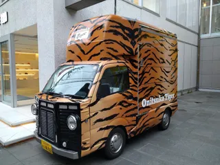 オニツカタイガーのデコ車 原宿から行くと、表参道ヒルズの手前を左に曲がると渋谷区立神宮前小学校があり、その先にオニツカタイガーの店があります。そこに止まっていたトラ柄のデコ車ですが、大阪で走ったら、おばちゃんたちが寄っていくに違いない(^.^)