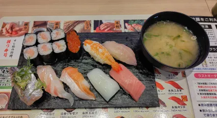 松屋系列、すし松でブランチ🍴平日限定ランチ🍣上握り🍣(本鮪中トロ・ヤリイカ・生サーモン・エビ・アジ・いくら軍艦・日替りネタ・ネギトロ巻)、青のり味噌汁付き😋プラス温うどんセット(わかめうどん)😊
