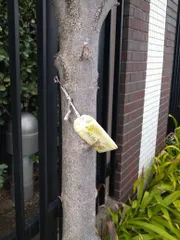なぜそこにお守りが・・・ これは昨日載せ損ねた写真ですが、誰かが落としたものを誰かが置いたのか、植木にお守りがかけられていました。