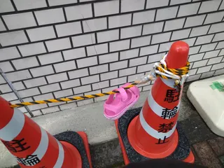 なぜそこに付ける 落とし物の子どもの履物を、誰かがわざわざマジックテープを外して、ロープに付けなおしていました。