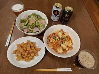 豆腐入り豚キムチ炒め🐷⬜️🥬じゃがいものコロコロ照焼き🥔サニーレタス・キュウリ・ハムのサラダ🥗【お酒】サッポロ黒ラベルヱビス プレミアムブラック老松酒造 大分麦焼酎