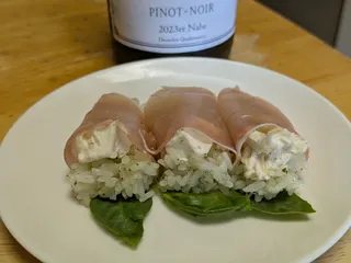 ワインのお供 ベランダ菜園のバジルを収穫して、ジェノベーゼを作った時の、ミキサーの残りをご飯でからめ取り生ハムとクリームチーズで巻いてワインのアテにしました😅