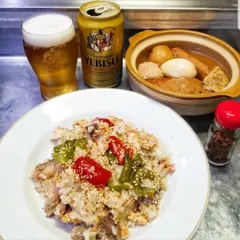 NEW 🐟秋鮭とピーマンの炊き込みごはん🐟 いよいよ寒くなってきましたね🎵おでん🍢の季節がやって来ました。今日は秋鮭とピーマンの炊き込みごはんにおでんです。魚料理の醤油の味わいには、ヱビスビールが良く合います🎵🍺👍