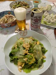 サクラビール✕レタスとたまご炒め サクラビールで乾杯🍻いつもの、夜何にしようかね~「昨日買ったレタス使わないとね」だね~ ^^;と言うことで、お家中華を楽しむことになりました (^m^)レタスとたまご炒め、ねぎチャーシュー、もやし炒め、ザーサイ、シュウマイをいただいた後は〆のチャーハンとヱビスビール🍺美味しかったですご馳走さまでした