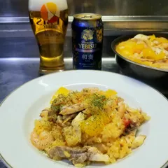 いつものシーフードパエリア🥘真鯛と小海老にサフラン、トマトなど。 ヱビスでは和奏が合いますね~🎵🍺👍優しいホップの香りが素材を活かした薄味に寄り添ってくれます。ここはJAZZYだと強すぎちゃうので和奏を買っとかなきゃなあ。