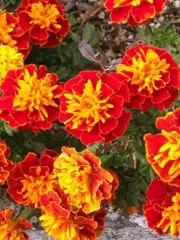 マリーゴールド 中心が黄色の赤色をしたフレンチマリーゴールドで、サファリレッドと言うそうです😊黄色やオレンジ色のマリーゴールドも可愛いですが、サファリレッドは、鮮やかな色彩で大輪なので、豪華な感じです✨初めて巡り逢いました💘お花も歌も、大好きです🥰