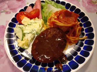 ハンバーグ といっても今日は手作りじゃなくて、鍋で温めるだけのやつ。時間が無い時は便利♡