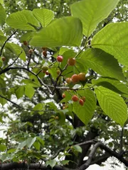 果物たち 我が家のさくらんぼが色づいてきました。大きな実にはなりませんが、ちゃんと花が咲いたのと同じくらい実になります。残念ながら、数年前に病気だか虫だかで木のメインになる幹が無くなり、今では枝一本で奮闘中です。ただ枝一本になってしまってからは、人間が食べる前に鳥たちが全て食べたり突いて落としたりしてしまうの
