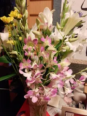 お隣さんから御下がりのお花をいただきました。 お隣の奥様から告別式の御下がりのお花をいただきました。旦那様の御冥福をお祈り致します。合掌🙏野菜作りがプロでした。釣ったお魚をいただきました。ありがとうございます。