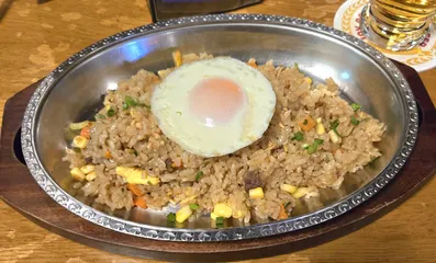ガーリックピラフ🧄 ビヤホール銀座ライオン7丁目店限定メニュー🦁以前はステーキが乗っていましたが、今回から目玉焼きにして、価格を下げました、それでもビヤホール価格😅美味しかったです😊