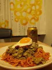 トマトとガーリックのソースのスパゲッティ。オリーブと舞茸を具に、ブロッコリーをくたくたになるまで煮込んだものを乗せ、粉チーズとタバスコをアホみたいにかけ、目玉焼きを添えて、ヱビスをいただきました〜!!