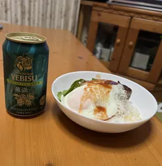 🍺薫満つと🍳🍚ロコモコ丼 🍺薫満つ、どんな味だろう❓と飲んでみると、ん❓思ったより苦みがあるけど飲みやすい。サッポロさんにしたら珍しい味だなと個人的に思いました。でも、この苦みがロコモコ丼の🍳半熟卵と合う❗️😋ハンバーグの肉汁も合う❗️一口で2度美味しい😋