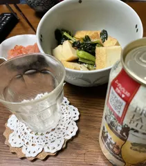 エーデルピルスと厚揚げ ベランダ栽培の小松菜🥬収穫厚揚げと煮物に 美味しい😋『火の用心の後の一杯は美味い😋』夫が育てた小松菜🥬『美味礼讃』