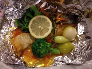 鮭のホイル焼き 何度も食べてきたけど、材料揃えて、下ごしらえしっかりしたものは本当に美味しいですね〜。ちょっと驚いた。ペコロスがちょっと辛かったので、次回はもっとよく火を通すそうです。