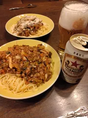 今日は赤星で! ミートパスタを頂きました。ちょっと多かったかなぁ?