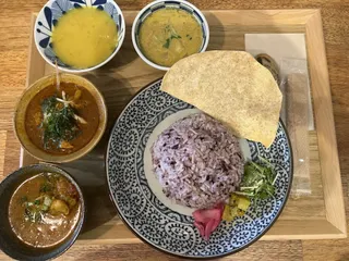 スパイスカリー。🍛 美味しいスパイスカリー🍛を堪能。 2種盛りカリー(チキンカリー・気まぐれカリー)とパパド(豆のクラッカー)。 プラス野菜のカリー。 豆のスープ。