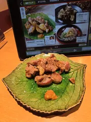 福地鶏塩焼き~柑なんば添え~福地鶏は銘柄鶏❓タブレットの説明によりますと広い鶏舎でストレスなく平飼い飼育された鶏で肉はしっかりとした歯ごたえがあってジューシーらしい🤔確かに歯ごたえはありました🐔柑なんばとは唐辛子のことを「なんば」と言うらしく、ここでの柑はゆずらしいです🤔柑なんばが鶏肉にマリアージュ