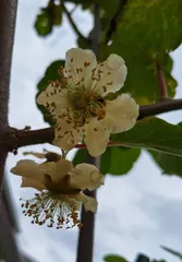 キーウィの花💠 庭のキーウィの花。咲いてるのをまともに見たことがなかったので、こんな可愛い花だなんて知りませんでした😅こっちは柿今年はたくさん実がなりそうです☺