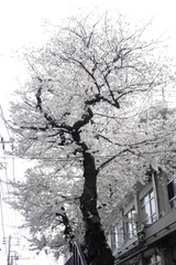 サンシャインシティ近くの信号にて 桜が信号の赤に照らされ、不思議な感じになっています。ちなみに右のビルがサンシャイン60です。