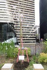 銀座三越の東の広場に 銀座三越の東側の広場に、新しく植えられた桜がありました。花がとてもかわいいので、つい3枚も載せてしまいました。この桜、舞姫という品種でした。植えたのが3月のようで、新しいはずです。