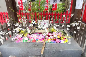 鳩森八幡神社 目白庭園から池袋駅まで戻った後、24時間券を買って東京メトロ副都心線でまず北参道駅に行き、そこから鳩森八幡神社まで歩きました。鳩森八幡神社には、けっこう桜がありました。下の写真は桜と社殿です。その参道に咲いていた桜はこちらです。手水舎の花手水はちょうど入れ替え前なのか、少しくたびれていました。社殿の