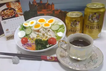 目覚めの悪い(?)朝は……まだ目が半分しか開いてない(?)ので、コーヒーより先にビール!少し目が覚めて来たのでモーニング・コーヒーとサラダ。食後はヱビ缶で身体がシャキッ、今日も一日頑張るぞぉ~!
