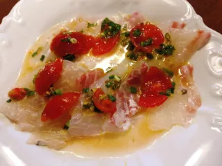 鯛のカルパッチョ レモンとミニトマトでちょっと酸味が強くなりました。トマトは無くていいかな。