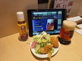 この日は休み!昼下がりから参戦です。! ↓まずヱビスバーからスタートは澄深しから。マリアージュメニューの香草のエビマヨ着。澄深しは二杯目。 いぶりがっこのポテサラ。鹿児島フェアメニューの大根の唐揚げ、あらびきソーセージ。三杯目はブラック。味噌串カツと。四杯目はアンバー
