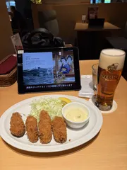 今日はカキフライと琥珀エビスプレミアムアンバーで始まりです。