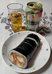 恵方巻×ヱビス サーモンが入った海鮮恵方巻と。節分ということをすっかり忘れていたのですが、会社で恵方巻の話をしていたら食べたくなって帰りに買って帰りました。まだあって良かった〜☺️