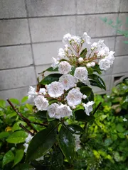 今朝の庭の、雨に濡れるカルミアと額紫陽花です。