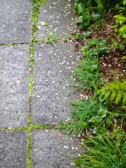 朝、出かけようとすると、ドウダンツツジが花ごと散らばっていました。