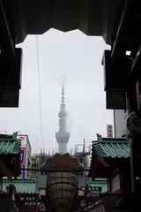 雨だから 新仲見世商店街から、東京スカイツリーを見た風景です。霞むのはしょうがないですね。