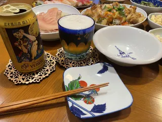 YEBISU BAR から帰って… 竹輪にきゅうり🥒を、詰めました右側には金沢の幸せののどぐろだし塩わさびを、添えて🫑の千切りめんつゆかつお節掛け大根千切りにツナ缶北海ホタテふりかけ和え…お好みでぽん酢ジョジョ缶+YEBISUつよさんから✨🎁✨のグラスで🍻✨🍻うふふ✨ヤー✨🍻🎶🍀