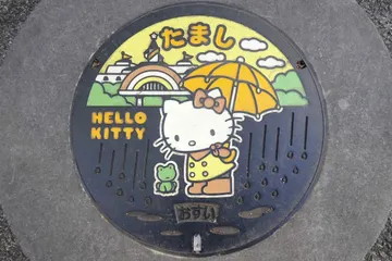 キティちゃんのデザインマンホール アイキャッチ画像は雨上がりの様子、下のは雨が降っているところです。これは新たに設置されたもので、多摩市が東京2020オリンピックの自転車競技ロードレースのコースになったことにちなんでいます。キティちゃんのマンホールカードは3枚ともありました。