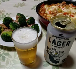 ホッピンラガーと🐔と🥦 タッカルビ🐔🧅🥕🥬~コチジャンと甘い味がけっこう美味しい😋😁ブロッコリー🥦に豚バラ巻いてみたら~これもけっこう美味しい😋😉ホッピンラガーと共にいただきました🍺✨🍺😄😄🙌